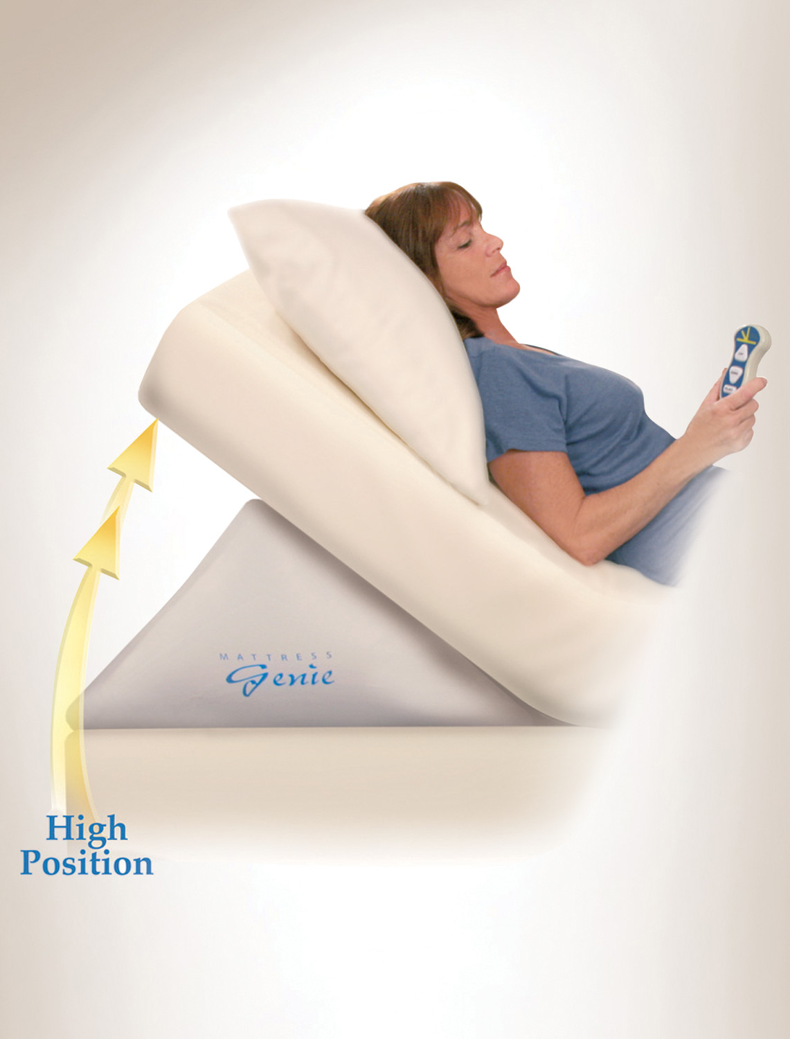 Mattress Genie® Incline Sleep System. Place this product beneath or on top of any traditional mattress to lift and lower the upper torso and hip area up to 8 inches to alleviate abdominal and stomach pressure. The elongated inflatable chamber is 48 inches in length allowing users to rest comfortably on the back or side. At the touch of a button, ... Doc Viewer